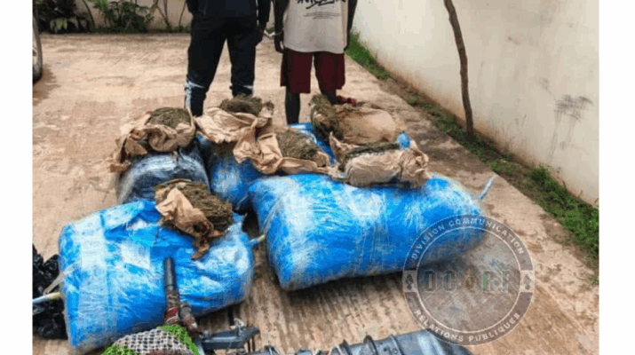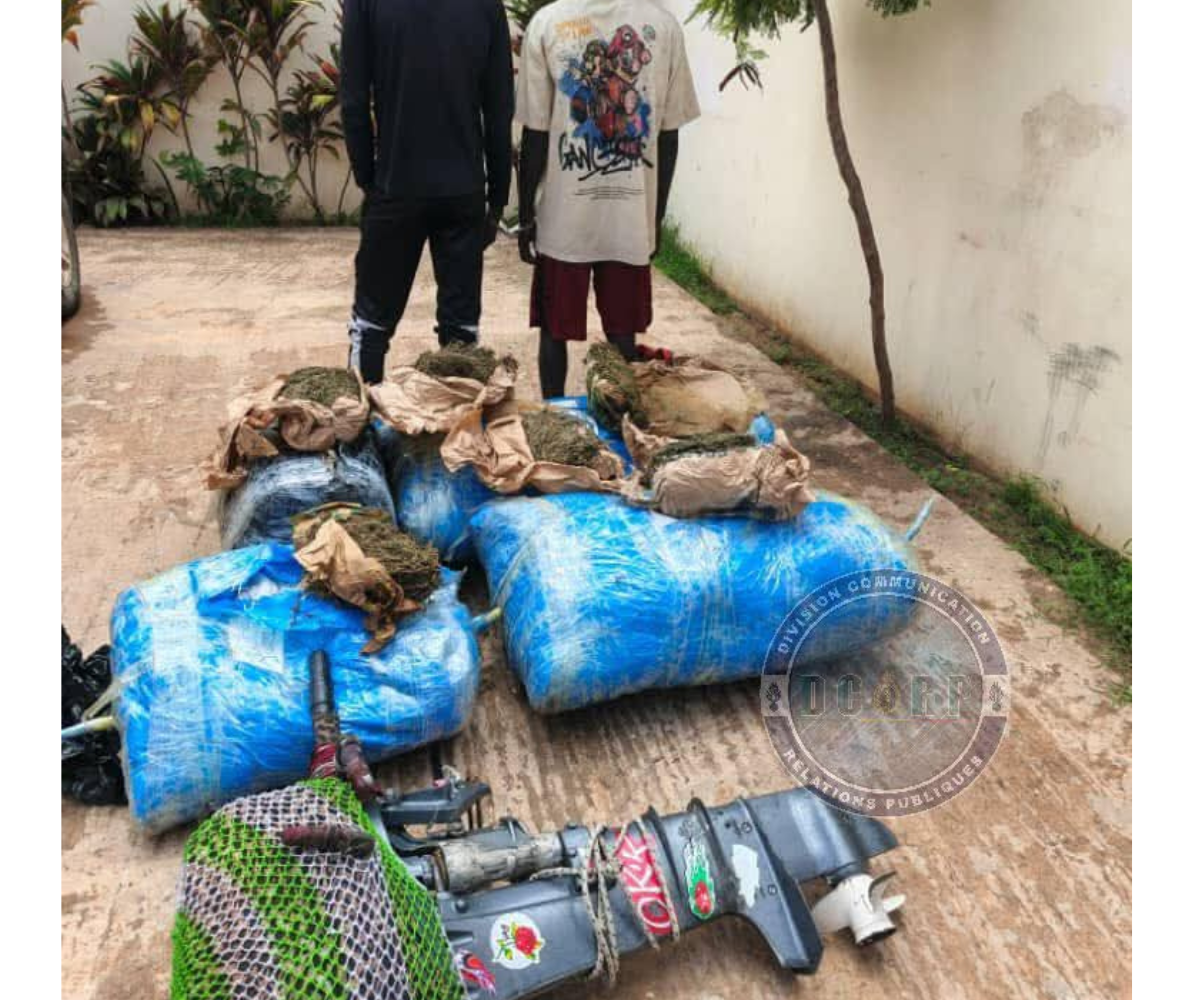 Cette action a permis l’interpellation de deux individus à bord d’une pirogue ainsi que la saisie de quatre ballots de chanvre indien d’un poids total de 243 kilogrammes soigneusement dissimulés sous des filets de pêche, d’une pirogue et d’un moteur hors-bord de 15 chevaux.