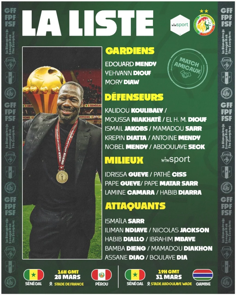 Pape Thiaw a convoqué ce jeudi 26 joueurs pour les matches amicaux de l’Équipe Nationale du Sénégal contre le Pérou (28 mars) et la Gambie (31 mars), qui auront lieu respectivement au Stade de France et au Stade Abdoulaye-Wade de Diamniadio. Pour la dernière liste avant le Mondial, Sadio Mané n’est pas présent, tout Cheikh Sabaly. En revanche, comme attendu, Bamba Dieng est bien là, Assane Diao aussi, comme Nobel Mendy.